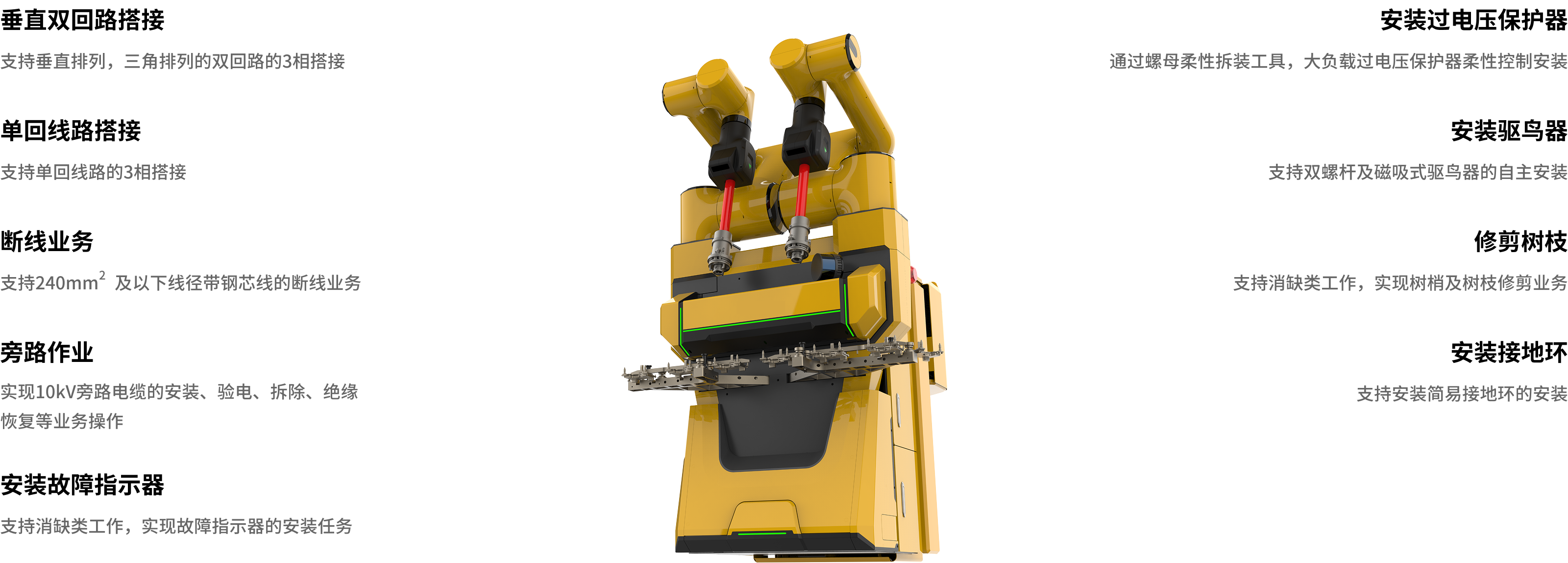 新一代带电作业机器人适应10kV配网架空线路,实现10kV杆塔及线路带电运维检修作业,在手臂负载、作业高度、感知精度、作业方式进行增强设计。业务类型由单回路搭接、断线业务扩展到大跨距、大持重类作业场景,新增业务包括垂直双回线路搭接、旁路作业、安装过电压保护器等作业场景。